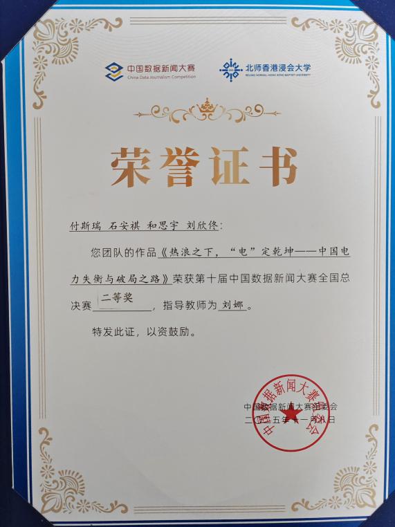 作品《热浪之下,“电”定乾坤——中国电力供需平衡之路》,作者为本科2023级新闻学专业的付斯瑞、和思宇,广告学专业的石安祺、刘欣佟。该作品紧扣“双碳”目标国家战略,系统梳理并展现了中国电力系统在供需平衡背后的结构性突破与发展路径,并结合典型案例、政策文本,通过数据可视化与叙事融合的方式,生动诠释电力在推动高质量发展与绿色转型中的关键作用。作品获得第十届中国数据新闻大赛全国二等奖,指导老师刘娜副教授获“优秀指导教师奖”。