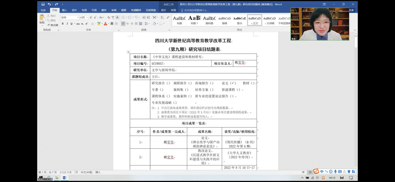20221114日,根据学校《关于开展四川大学新世纪高等教育教学改革工程 (第九期)研究项目结题工作的通知》要求,我院认真组织进行了九期教改项目的结题初评会议。会议由我院副院长罗鹭教授主持,本科教务办主任周仁平老师、本科教务宋雯老师出席了会议。我院项目负责人和成员老师代表进行了项目汇报。