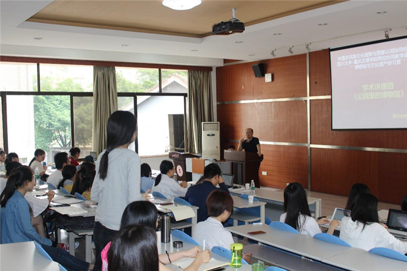 活动期间,中心学者为研习营师生带来了四场与博物馆相关的报告,阐述了进入和研究博物馆的不同视角。邱硕副研究员以成都城与宽窄巷子的历史空间变迁,以及宽窄巷子在现代的修复、改造为基础,讲述了城市空间的实践变迁与新表述空间。访问学者艾莲以意大利的生态博物馆——圣阿纳托利亚的麻博物馆为例,展示了麻从生长到加工的完整的过程,以及麻在人们生活和生产中的实际用途,同时展示了改博物馆的教育功能,扩展了对生态博物馆的基本认知和理解。梁昭副教授主要结合成都博物馆和广西壮族三月三节庆活动,讲述其中的声音如何被展示,区分了声音的层次和功能,提出思考什么样的声音值得被记忆以及有什么更好的方式展现它。徐新建教授结合成都望江公园和薛涛纪念馆,阐述了文化空间的关联问题,提出空间承载文化,文化生产空间的观点。参加讲座的两校师生积极参与、热情讨论,学习氛围浓厚。